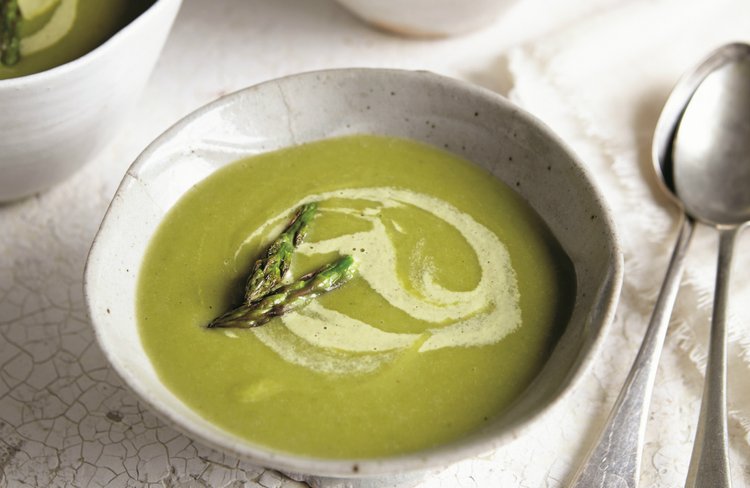 In batches, puree the soup in a blender, adding the broth first, then the vegetables and asparagus. Blend until velvety smooth, about 2 minutes. If the soup is too thick, add more broth 1/2 cup at a time. Return the soup to the pot and gently reheat. Taste: you may want to add a pinch of salt or a squeeze of lemon.
